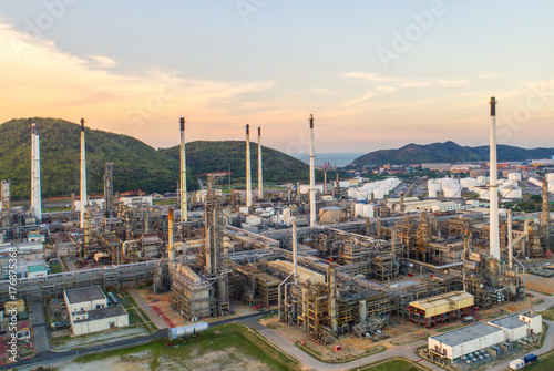 © MAGNIFIER, Obraz premium Aerial view Oil refinery.Industrial view at oil refinery plant form industry zone with sunrise and cloudy sky.Oil refinery and Petrochemical plant at dusk,Thailand. Oil refinery background sunset.