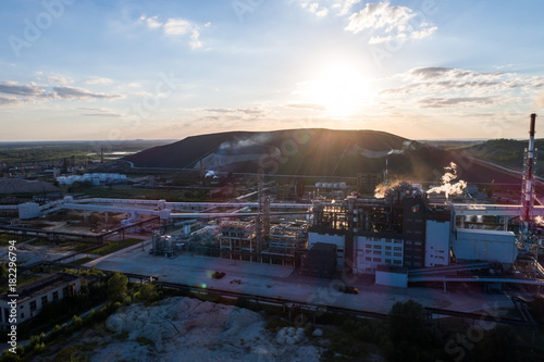 Obraz premium Aerial view Oil refinery with a background of mountains and sky at sunset. Aerial photography. Kohtla-Järve city, Estonia, Ida-Virumaa.