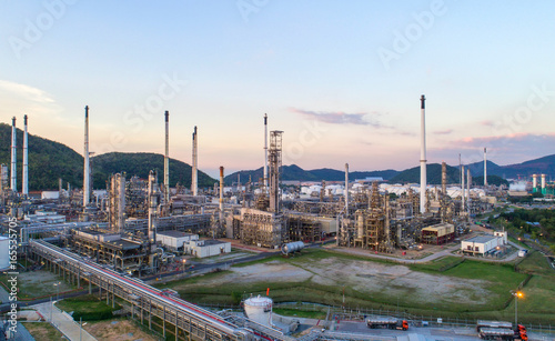 © MAGNIFIER, Obraz premium Aerial view Oil refinery with a background of mountains and sky.The factory is located in the middle of nature and no emissions. The area around the air pure.