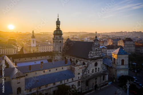 © Ruslan, Fototapeta premium Aerial view on Bernardine church in Lviv from drone