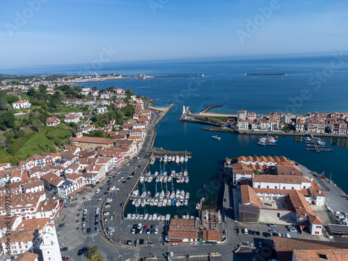 Obraz premium Aerial view on Ciboure and Saint Jean de Luz bay, port, sandy beach on Basque coast, beautiful architecture, nature and cuisine, South of France, Basque Country
