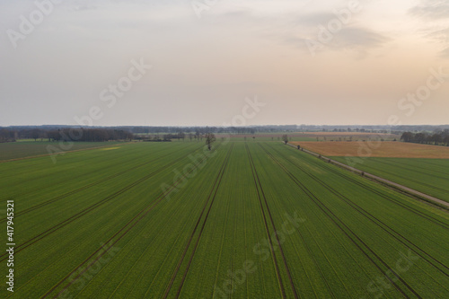 © JS_Fotoworx, Obraz premium Aerial view on farm field at sunset