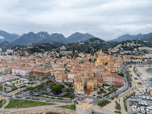 © barmalini, Fototapeta premium Aerial view on French Riviera, colorful Menton old city and marina on Mediterranean Sea near French-Italian border, travel destination, panoramic view from above