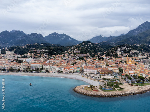 © barmalini, Fototapeta premium Aerial view on French Riviera, colorful Menton old city and marina on Mediterranean Sea near French-Italian border, travel destination, panoramic view from above