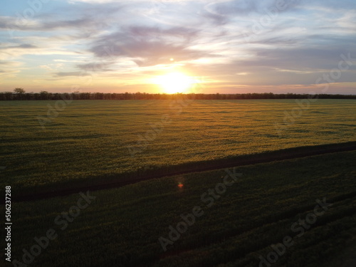 © panophotograph, Fototapeta premium Aerial view on green wheat field in countryside. Field of wheat blowing in the wind on sunset. Young and green Spikelets. Ears of barley crop in nature. Agronomy, industry and food production.