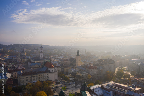 © Ruslan, Naklejka premium Aerial view on Jesuit Church, City Hall and Latin Cathedral in Lviv, Ukraine from drone