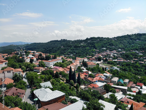Obraz premium Aerial view on Mountains and City Roofs