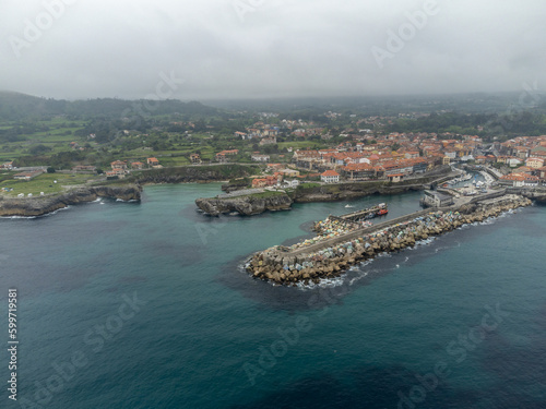 Fototapeta premium Aerial view on Playa de Toro and Llanes old harbour, Green coast of Asturias,...