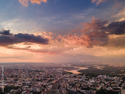 © Hennadii, Fototapeta premium Aerial view on rain clouds at sunset over the city