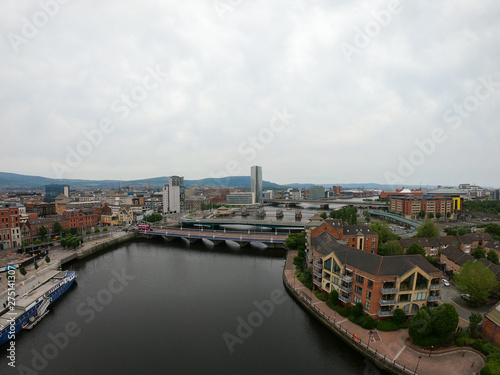© Maciej, Fototapeta premium aerial view on river and bridge in belfast northern ireland. beautiful landscape by city view from above