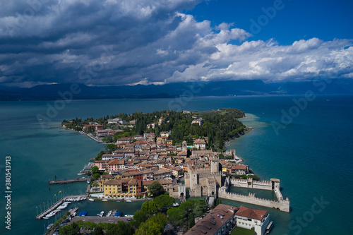 © Berg, Naklejka premium Aerial view on Sirmione sul Garda. Italy, Lombardy. Cumulus clouds over the island of Sirmione. Aerial photography with drone. Panoramic view at high altitude. Rocca Scaligera Castle in Sirmione.