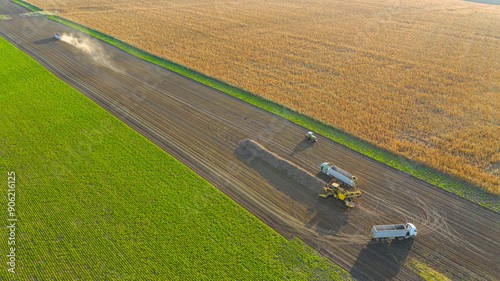 © Roman_23203, Fototapeta premium Aerial view on truck shift, loading sugar beet for transportation