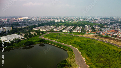 © syahrir, Fototapeta premium Aerial View or Drone Shot. Beautiful Residential area and garden view after rain