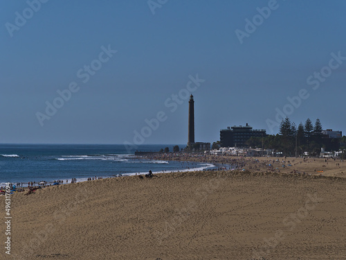 © Timon, Fototapeta premium Aerial view over crowded beach Playa de Maspalomas with sand dune in front and lighthouse Faro de Maspalomas in the south of Gran Canaria, Spain.