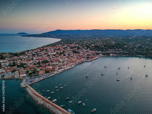 Fototapeta premium Aerial view over Koroni seaside city at sunset. Koroni, Messenia, Greece