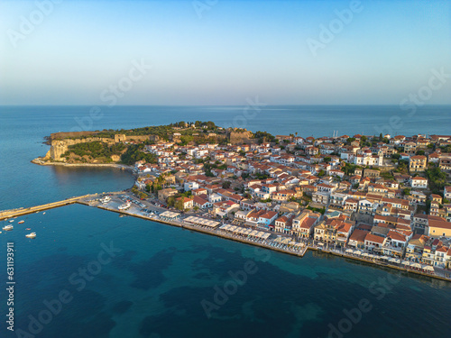Naklejka premium Aerial view over Koroni seaside city at sunset. Koroni, Messenia, Greece