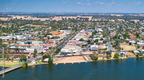 © Alistair, Obraz premium Aerial view over Lake Mulwala and looking down the main street of Yarrawonga