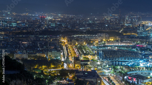 Obraz premium Aerial view over square Portal de la pau day to night timelapse in Barcelona,...