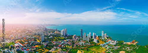 Obraz premium Aerial view panorama Pattaya with Sanctuary of Truth wooden temple on beach...