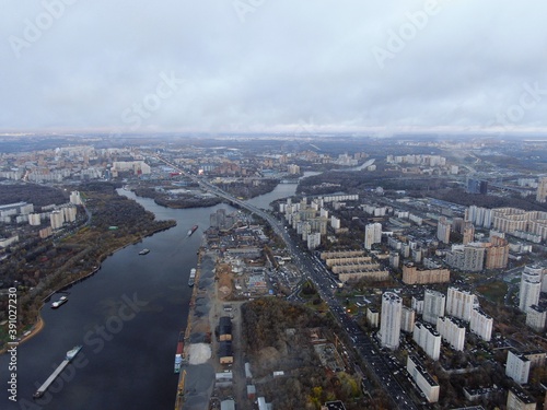 © Max, Obraz premium Aerial view panoramic cityscape with great height. River in a big city from a drone