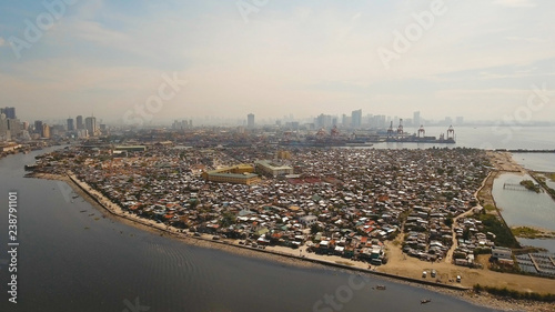 Obraz premium Aerial view poor district of Manila slums, ghettos, wooden old houses, shacks. Slum area of Manila, Philippines. Manila suburb, view from the plane.