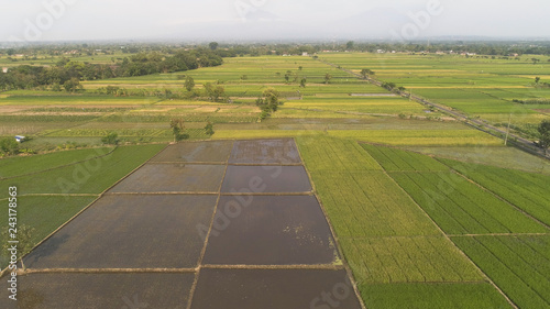 Obraz premium aerial view rice fields, agricultural land with sown green in countryside. farmland with agricultural crops in rural areas Java Indonesia. Land with grown plants of paddy