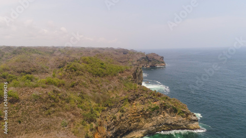 © Alex Traveler, Fototapeta premium aerial view rocky coastline with cliffs, ocean surf with breaking waves in coast. seascape waves break on rocky shore java, indonesia