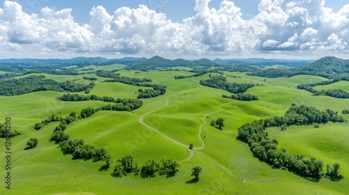 © tugkiara, Fototapeta premium Aerial view rolling green hills, sunny day, pastoral landscape, travel brochure