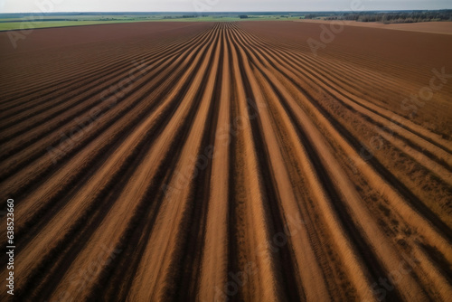 Naklejka premium Aerial view ; Rows of soil before planting. Furrows row pattern in a plowed field prepared for planting crops in spring. Aerial view of land prepared for planting and cultivating the crop