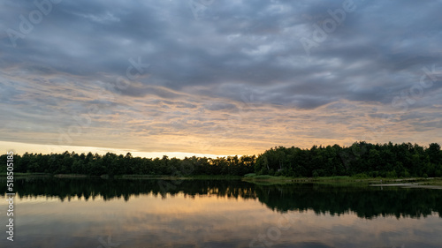 © Bjorn B, Fototapeta premium Aerial view, shot by a drone of a sunset at coast of the lake. Nature landscape. Nature in northern Europe. reflection, blue sky and yellow sunlight. landscape during sunset. High quality photo