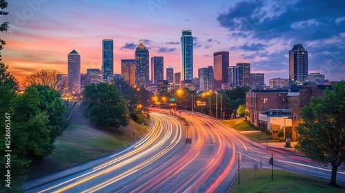 Fototapeta premium Aerial view showcasing a vibrant city skyline, featuring a bustling highway and illuminated street light against a twilight backdrop.