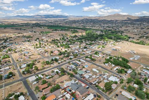 © Allison, Fototapeta premium Aerial view shows a small town with majestic mountains behind