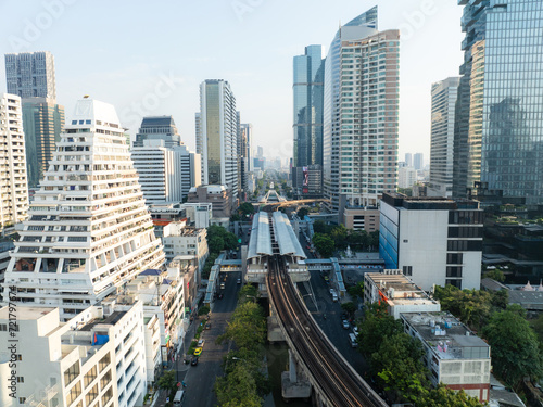 Fototapeta premium Aerial view Silom city building with BTS skytrain