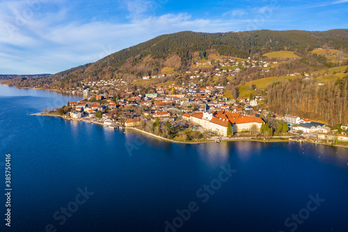 Fototapeta premium Aerial view, Tegernsee, place Tegernsee and monastery Tegernsee, Upper...