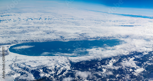 © travelview, Fototapeta premium aerial view to great salt lake near salt lake city in Utah in snow
