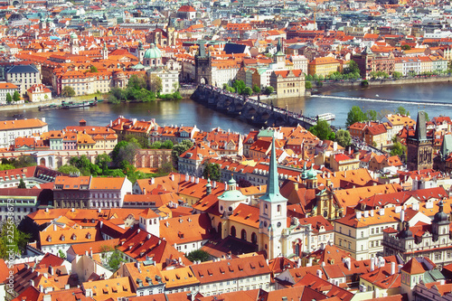 Obraz premium Aerial view to Prague historic center with Charles Bridge in the middle