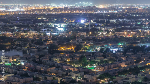 Obraz premium Aerial view to villas and houses with Golf course night timelapse