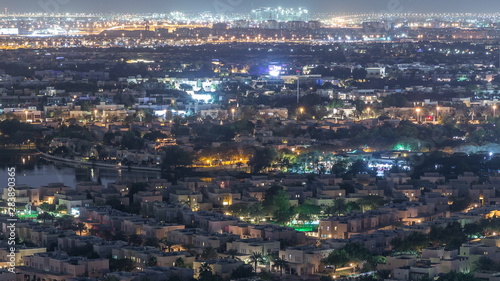 Naklejka premium Aerial view to villas and houses with Golf course night timelapse