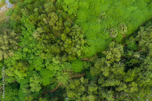 © Panya, Naklejka premium Aerial view Tropical Rainforest trees mountains,Top view green forest background