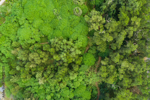 © Panya, Naklejka premium Aerial view Tropical Rainforest trees mountains,Top view green forest background