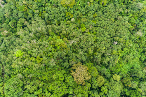 © Panya, Fototapeta premium Aerial view Tropical Rainforest trees mountains,Top view green forest background