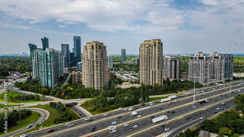 Fototapeta premium Aerial views of high-rise residential buildings near the 401 expressway and Yonge Street in Toronto. The bustling highway, surrounded by lush greenery and modern architecture, creates a dynamic