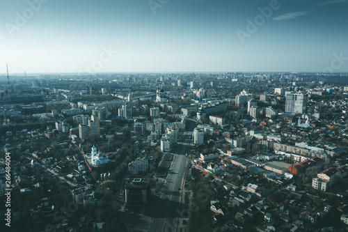 Fototapeta premium Aerial Voronezh city midtown panorama at sunset, roads with car traffic and buildings, center of old European city in spring, drone photo