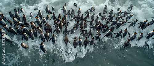 © SJarkCube, Fototapeta premium Aerial wide view over the Earth's South Pole Area of Photographs of Penguin reflect the daily life in various poses of wild animals in groups of families or species societies