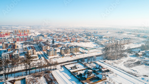 © Ruslan Ivantsov, Obraz premium Aerial winter top down view high above rural slow living by small river.
