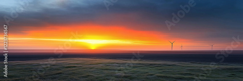 © VicPhoto, Naklejka premium Aerogeneradores en un campo al atardecer, energía sostenible.