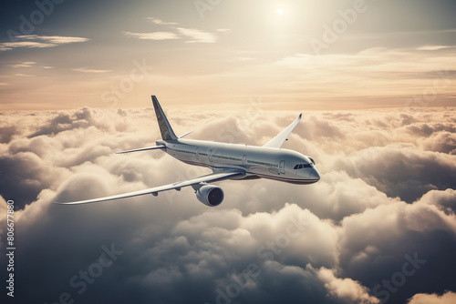 Obraz premium Aeroplane Soaring Above Clouds Illuminated By The Sun - Generative AI