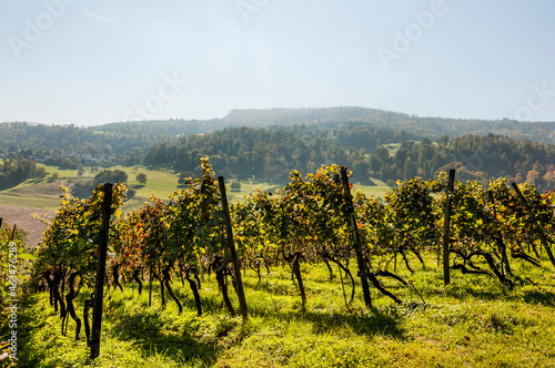 Naklejka premium Aesch, Klus, Weinberge, Rebbergweg, Pfeffingen, Birseck, Baselland, Wanderweg, Landwirtschaft, Herbst, Herbstfarben, Schweiz, Nordwestschweiz