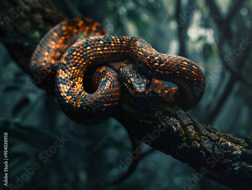 © Noah, Naklejka premium Aesculapian snake coiled around a tree branch, with its sleek body highlighted against a dark forest background, cinematic style, Compositing Core, 8k, detailed,