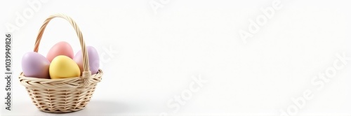 © Trust Fish, Naklejka premium Aesthetic Arrangement of Colorful Pastel Easter Eggs in a Basket Against a Clean White Background